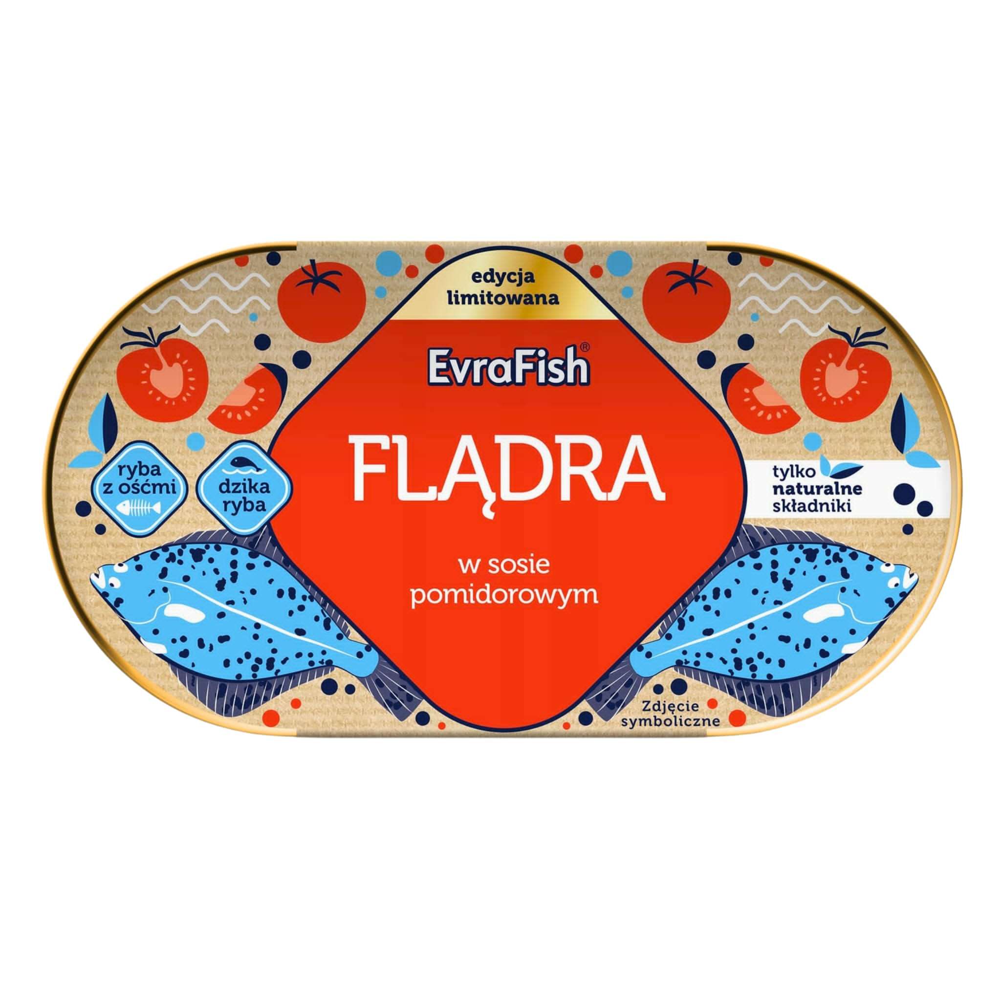 60% tusza z flądry(storni) ze skórą, 40% sos pomidorowy: woda, 21% koncentrat pomidorowy, cukier, olej rzepakowy, ocet spirytusowy, skrobia modyfikowana, cebula prażona, sól, pasternak suszony, papryka słodka, ekstrakty przypraw.