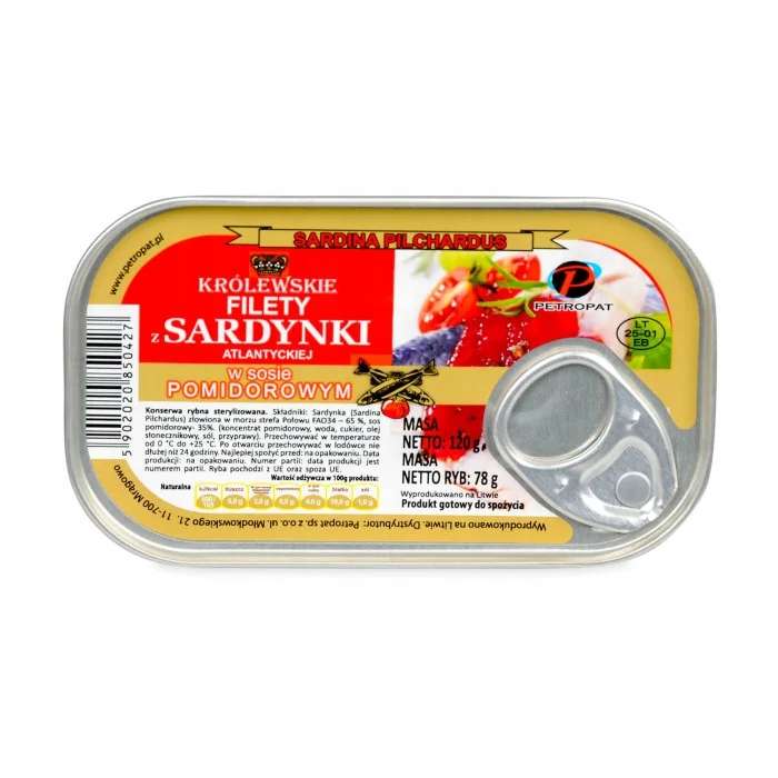 Konserwa rybna sterylizowana gotowa do spożycia. Sardynki do produkcji dziko złowione na środkowo- wschodnim Atlantyku.